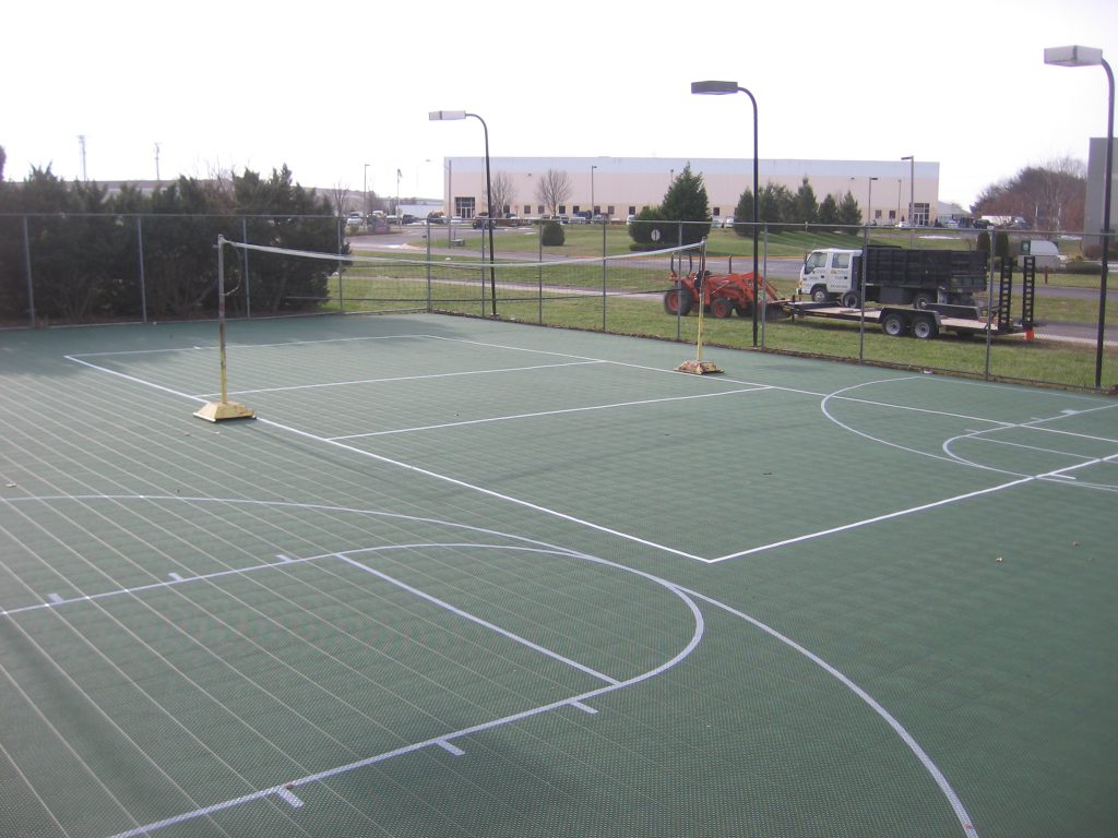 Tile Installation: Once cured, we laid down our signature court tiles, carefully aligning custom colors and sport lines.